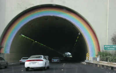 These are the photos we took as we left San Jose and headed North. With absolutely no idea of times, distances or hotels, we took pretty much pot luck. Our intention on Friday evening was to get as far North up Route 1 as we could. Having done that we figured that we could finish off California on Saturday and do Oregon and Washington on Sunday... So Dave convinced the company he was working with that he needed to go by 3:30, and by 4:00pm Ann and Dave were on the road. Highway 101 is not very pretty, so we didn't take any photos of that. San Francisco we've been to before, and we just sat in traffic. The Golden Gate bridge, however, was fantastic as ever and at the time of writing is still standing. This is view of the GG bridge as you approach it on the 101 from the San Francisco side: And this is the bridge as you go across it. Is really very impressive... Having gone over the Golden Gate bridge you go through this tunnel - love the rainbow! Once through their the road goes uphill a bit and curves back slightly so you can look back at an impressive vista of San Francisco. There is a look out point here, which we (a) didn't have time to stop at, and (b) missed as we drove by... Sadly we haven't got a photo of the Pelican Pub - which was built by a British bloke as an exact replica of his favourite pub in the UK. We didn't get a chance to stop there - but I'm determined to go there soon. Turns out my US cousin (Mark) drinks there regularly and lives about five miles from there. Once we got over the Golden Gate bridge, you turn left and head along Route 1. This is the coast road - situated halfway up the cliffs. Very spectacular and suitably difficult to drive along. Mind you, years of practice driving round Yorkshire on titchy roads with sheep on them helped out. This is a view out into the (foggy) pacific during a steep descent: