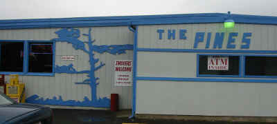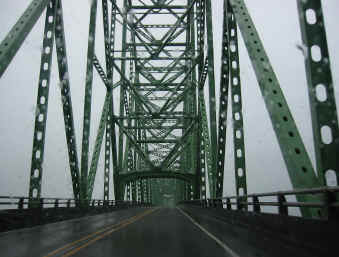 We loved the sign - "Divided we fall", remember that this trip was shortly after September 11th, and so everywhere was being suitably patriotic - and rightly so. Furthermore - you'll note that this restaurant, unlike ALL the ones in California, welcomes smokers. Not that we smoke, but it was nice to see... All right - taking a photo of the outside of a restaurant is a bit tacky, but the wood pine tree was kind of nice... And so onwards, North... Another hundred miles or so (we'd done so many miles another hundred was just a moment's driving). Eventually we reached the border with Washington State. There's a long long bridge over the River Columbia that marks the border between Oregon and Washington. It was raining by this time. But then, we we're right near Washington.