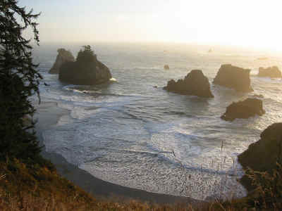Sunday morning dawned with pretty much the same weather as Saturday - i.e. a bit foggy but generally good. We hit the road as early as possible and filled up with petrol at the nicest full service garage in the world. I guess I should emphasise that petrol is effectively free here in the States, and the entire trip (nearly 2000 miles) cost us about $60 (40 quid) in fuel... More spectacular scenery - here's some rocks in the sea somewhere off the coast of Oregon: