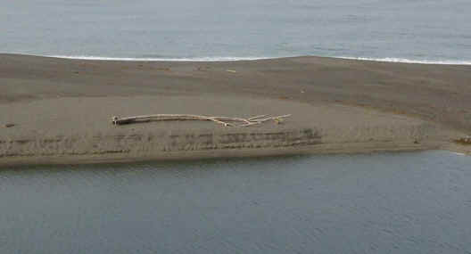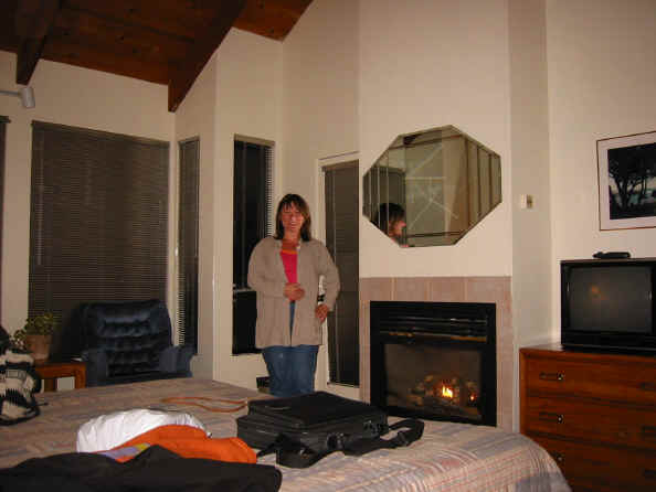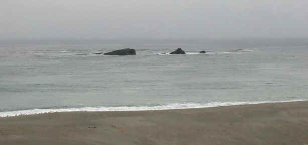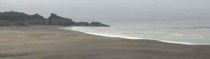 Firstly, they only had a single room left - here's a picture of Ann standing in the room: So - what's all that criss-cross pattern in the mirror? Was the place haunted? Was a trick of the light? Who knows... The room was great - high vaulted ceilings, a gas fire and jacuzzi bath for two. Ann and I went for a meal to the local hostelry, and then returned to the hotel to check out the jacuzzi - where there was even a free bottle of champagne which Ann and I drank sitting in the bath. Lovely! The Pacific Ocean crashed on the shore about 50 feet away. We turned the lights out and it was DARK! We went to bed and slept very peacefully until 3:18am. A blood curdling scream! "Aaaaahhhhhahahaaaaaaaahhhhhwwwwwooooooooaaaaahhhhhhhhh" it went for about ten seconds. Silence. It was 3:18 (the time is engraved on my memory). It was about as dark as it was possible for it to be, and Ann and I were sitting bolt upright. "What the f*** was that?" one of us said. Well - it was probably the guy next door having a nightmare. It could have been a coyote. At 3:18 in the pitch dark it felt that the most likely culprit was the guy next door having had his insides ripped out by a mad axe murdered. This self same axe murdered was at this very moment making his way to the next door room to satisfy his thirst for blood and pain... It was tough to sleep and Ann made me get up and turn on the laptop for some light in the room. Actually, I was quite keen to turn it on for some light and didn't need any persuading! Anyway - that was the night in the possibly haunted, possibly stalked by mad axe murderer, Seacliff on the Bluff. The view from the window the next day was spectacular,.. (Above) That's the Pacific Ocean on the other side of the beach - where an entire tree had been washed up. Below is the view to the left up the beach: Below is the view a bit to right down the beach... It was Saturday morning and time to hit the road and head North. We had the rest of Route 1 to do, before joining Highway 101 and traveling up the Oregon coast. Click here for the next stage...