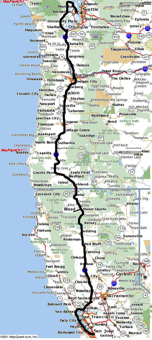 California Trip - Route heading SouthBack to the story and photographs This is the route South that we took - from Bainbridge Island all the way down to San Jose. Weed, where we stayed overnight, is marked - about an inch over the border into California. |