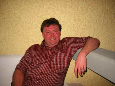 here, sitting on the balcony of our grade A room, he's had a drink or