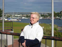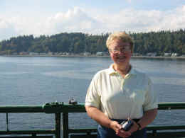 Janet on the ferry with an appropriately beautiful view of Bainbridge Island behind her...
