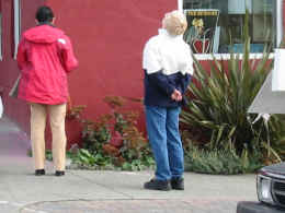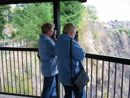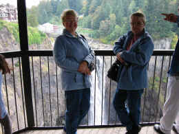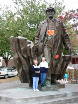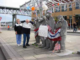 Janet and Judy in Fremont with an inappropriately large statue of Lenin behind them... Lenin in Fremont? Quite why this bastion of the evil empire is honoured with a huge statue here in the heart of democratic America is not really clear. But he's very imposing, and makes a nice place to have your photograph taken. Janet and Judy at Snoqualmie Falls with a indisputably large waterfall behind them. (Enough of that - Ed.) Janet and Judy is typical pose - i.e. with camera glued to eye. Janet and Judy in Fremont again - this time at the "Waiting for the InterUrban" statue (lot of public art in Fremont...) Today the statue has been dressed up in anti-war gear in protest at the US's bombing of Afghanistan. Judy looks up to find God. (Actually, she's examining the tail section of the rocket at The Rocket Cafe.)