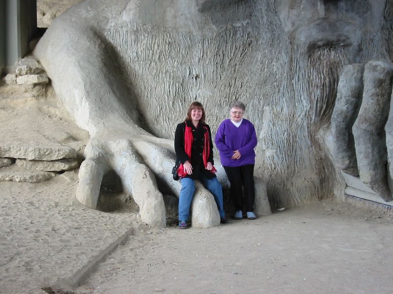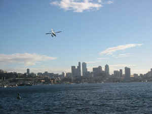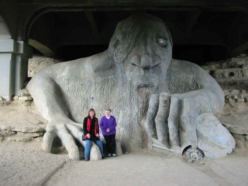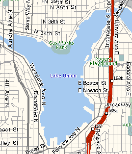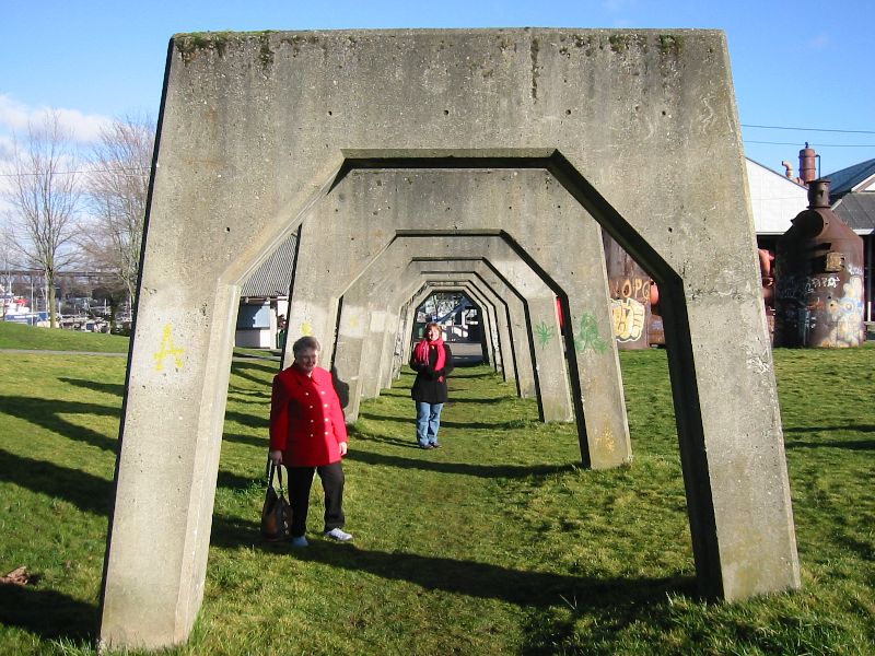 browser ( First up is the un-missable trip to see the troll at Fremont. Made of concrete and sporting a real VW Beetle as its meal of the moment, the troll lives under Aurora bridge... Next ... On to Gasworks park where the old gasworks was, now turned into a park for all to enjoy, with its own special kind of public art... Gasworks Park is on the edge of Lake Union: (Click on the map for an aerial photo - use browser "Back" button to get back) This is Shirley and Ann under the tunnel of concrete arches that presumably used to carry pipes and the like: Here's Shirley in front of one of the old gas pumps, now brightly painted and firmly set into concrete... The park sticks out into Lake Union - here's Shirley with Seattle behind her - Space Needle is on the right hand side of her, with the majority of downtown on the left. Lake Union is where the float-planes take off and land. They go up to Canada and do sight-seeing trips over Seattle. Here's an action shot of a float-plane just taking off (or was it coming into land?) See the other page of photos by clicking here... |