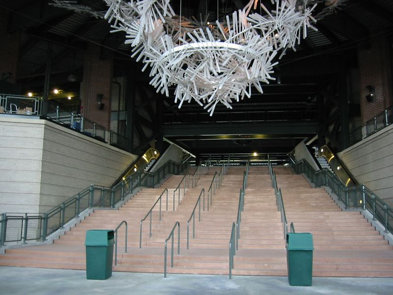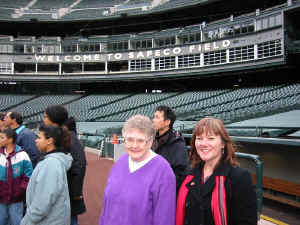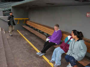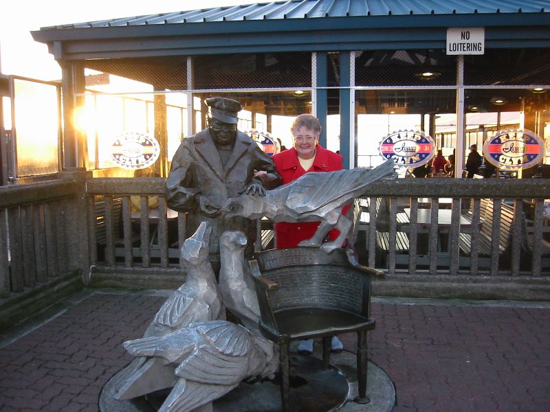 We took a trip round the SafeCo field - which is the local baseball stadium, home to the Mariner's, our local and favourite baseball team. The Mariner's web site is here. The SafeCo field is a superb piece of engineering with a sliding roof to allow the stadium to be undercover in the rain, and out in the open in the sun... This is Shirley and Ann standing on the edge of the field itself - behind them is the press box with "Welcome to SafeCo field" on it. Made from a thousand transparent baseball bats, this is one of the pieces of baseball related artwork that is in the stadium. There are flashing lights representing photographers flashbulbs going off, and the bats are arranged such that there are 500 left handed and 500 right handed swings "in progress" frozen in time. This piece of art hangs over the South West entrance to the field. Shirley in the dugout - this is the Mariner's dugout, where the team hang out while the game is on, waiting for their turn... While Shirley was on Bainbridge Island, we bumped into Terri and Bob - two friends of ours, and we went round to their house for breakfast and took a walk along the sea shore afterwards. At this point in time they were living right on the waterfront in the tiniest cabin in the world... They took this photo of us Ivar's clams is one of the oldest restaurants in Seattle, right on the waterfront next to the ferry terminal. This sculpture is of the original Ivar feeding the seagulls.